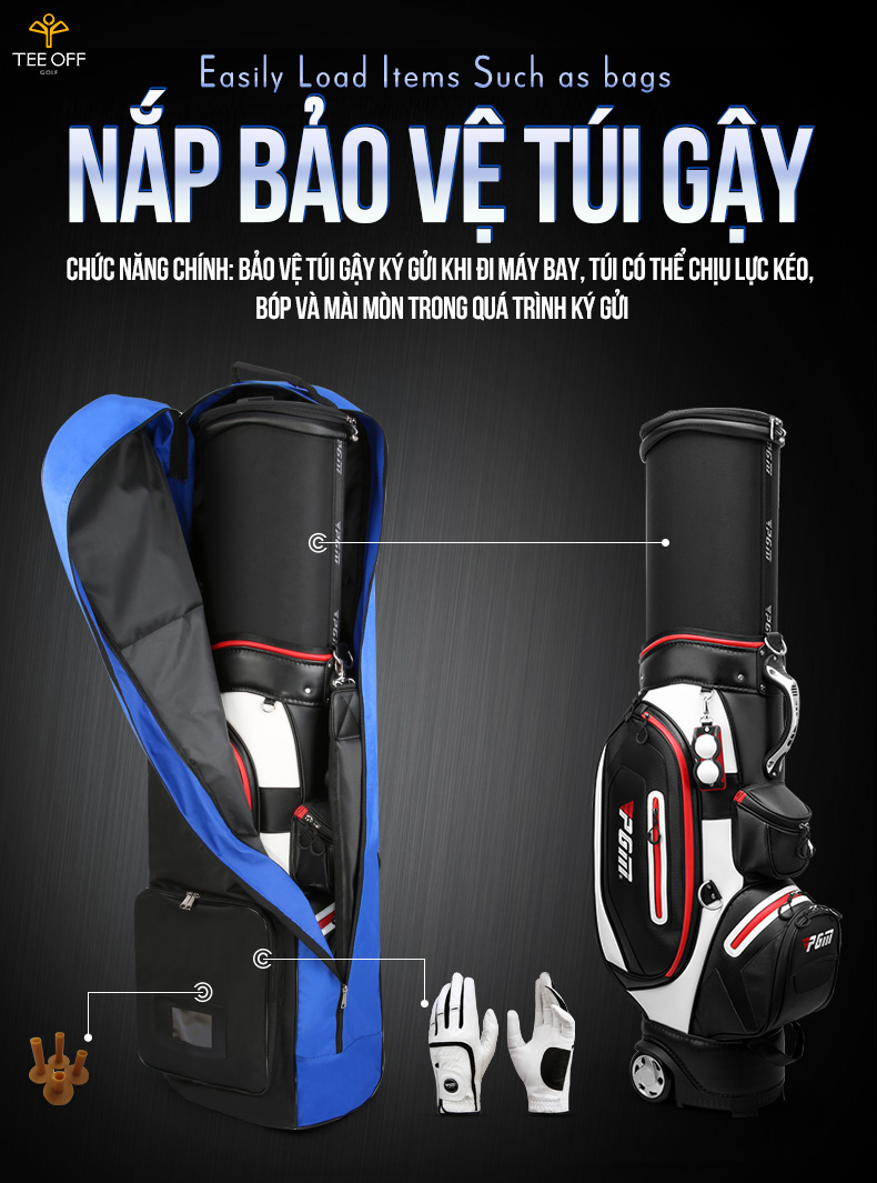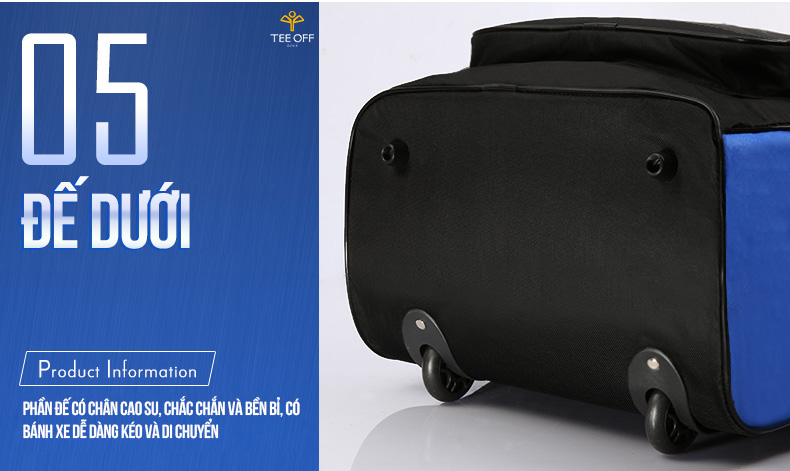 - Các bộ phận đế và bánh xe sử dụng nhựa cao cấp, giúp ổn định túi, bảo quản các gậy golf chống va đập.