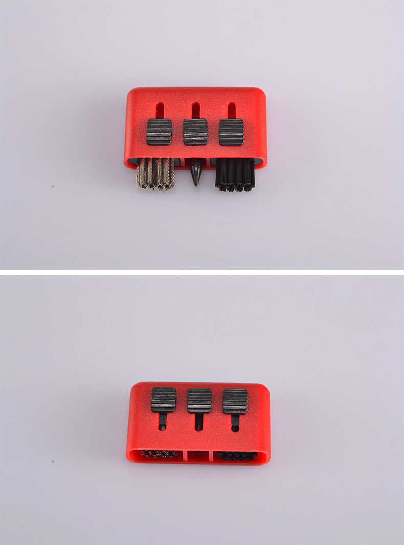 - Bên trong là hai đầu bàn chải một đầu bằng sợi nhựa và một đầu bằng sợi kim loại.