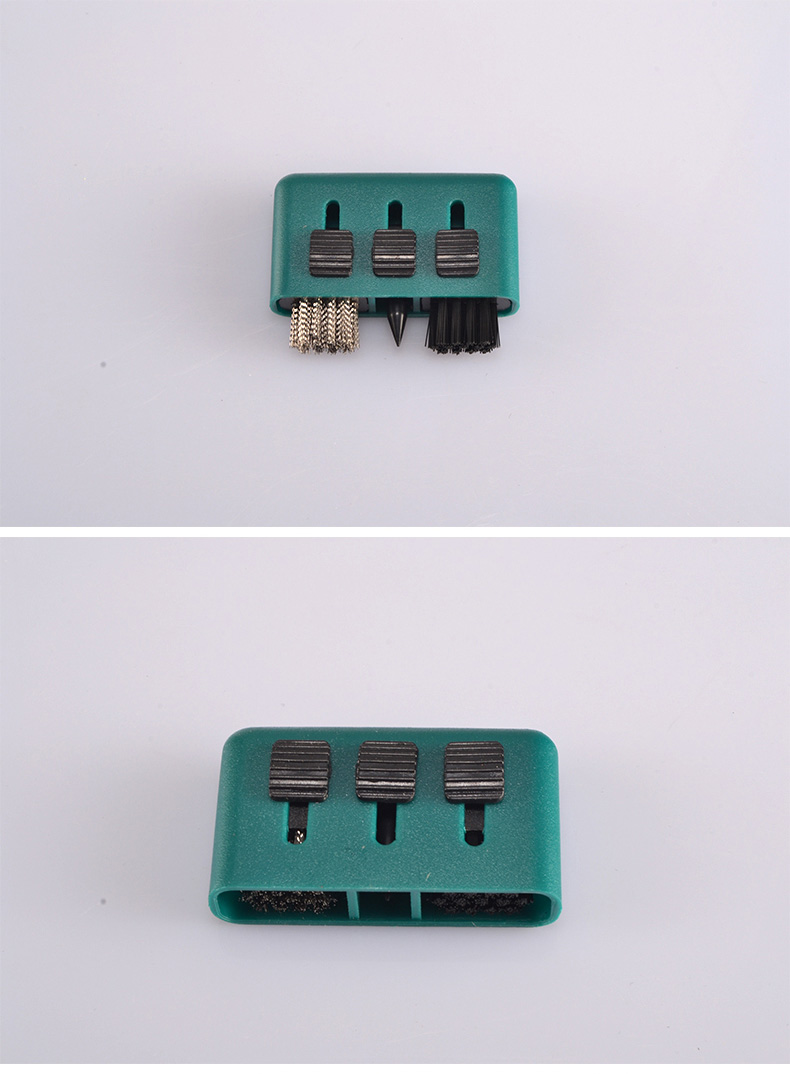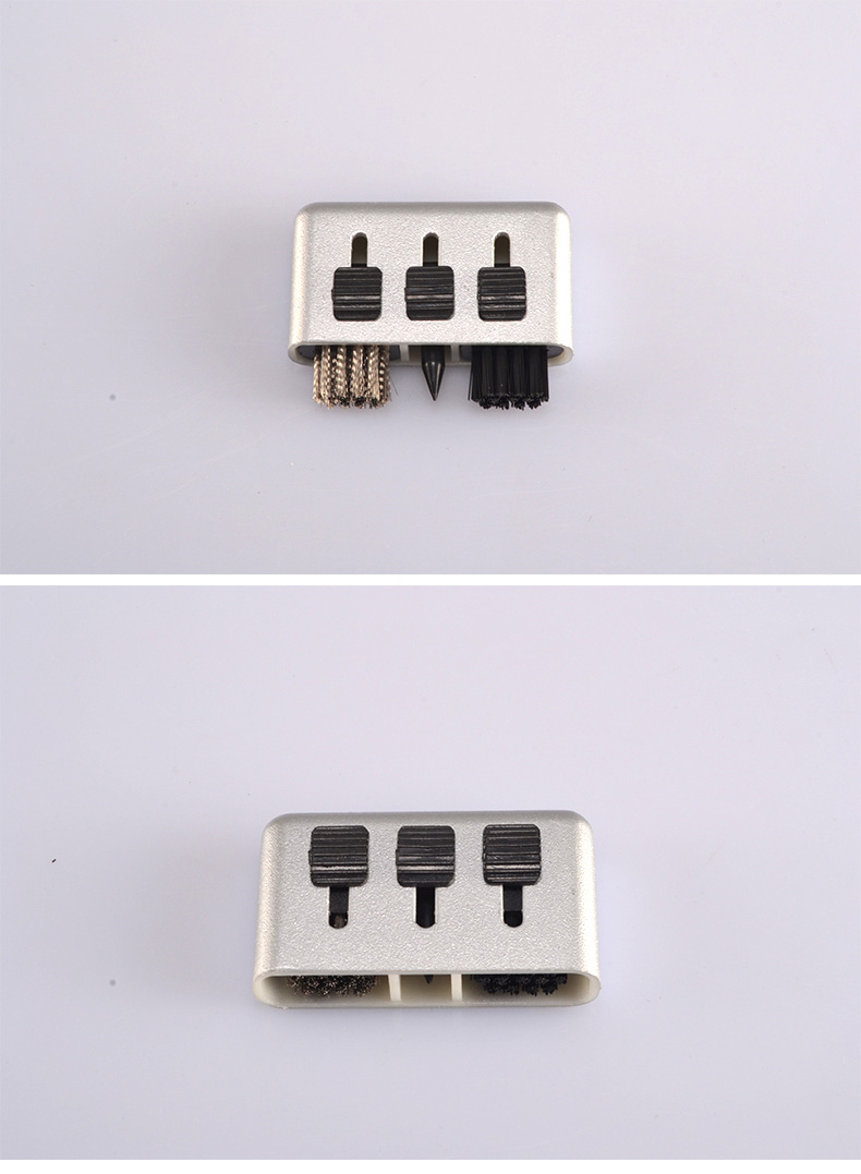 - Hai đầu chải bằng hai loại chất liệu khác nhau giúp golfer có thể sử dụng mỗi loại đầu chải cho từng loại mảng bám cần vệ sinh : Đầu chải sợi nhựa làm sạch các vết bẩn thông thường, đầu chải sợi kim loại làm sạch các vết hoen rỉ lâu ngày