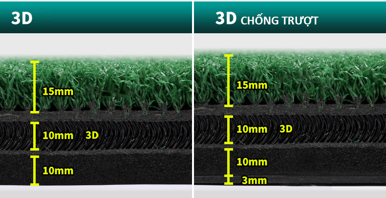 - Bề mặt cỏ ngắn dày 1,5cm, lớp cỏ dài phía trên dày khoảng 3cm.