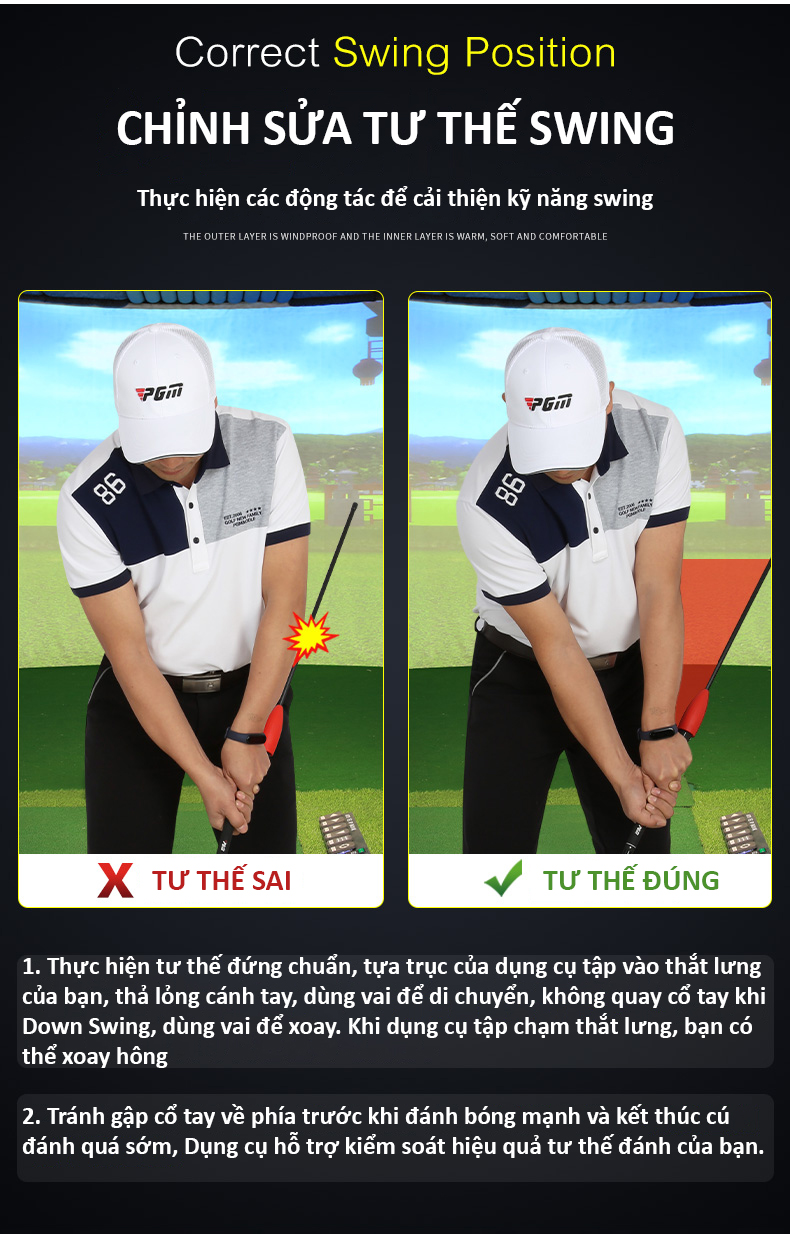 - Dụng cụ sửa tư thế cho người mới chơi sẽ giúp các Golfer sửa tư thế để tay sai trong lúc thực hiện cú đánh Swing.