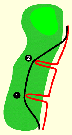 Hình bên mô tả một chặng golf mà khu tee ở dưới còn green trên đầu. Giờ tưởng tượng đường cho xe chạy bên phải từ dưới lên dọc theo fairway. Quả tee shot của bạn hạ xuống vị trí 1. Đánh đẹp! Bóng trên fairway đấy!