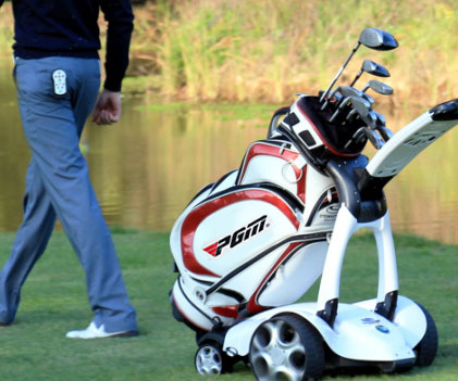 Caddie chạy điện. Nó là cái xe chở đồ tự đẩy. Cơ bản nó là chiếc xe điện nhỏ mang túi golf cho bạn. Kiểu cũ thì bạn còn phải dùng tay chỉnh hướng đi cho nó nhưng kiểu mới bạn có thể dùng bảng điều khiển không dây cho nó đi theo ý mình đến khắp nơi trên sân golf.