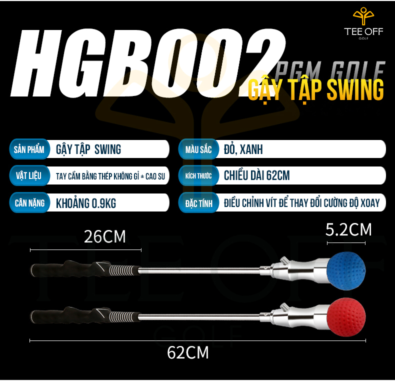 - Điểm nổi bật của gậy tập Swing HGB002 so với gậy HGB001 là nó được thiết kế thêm bi hồi có âm thanh báo, mục đích giữ nhịp lên Swing và xuống Swing một cách nhịp nhàng nhất, người tập có thể tự kiểm soát động tác, nắm bắt và sửa những lỗi sai kỹ thuật.