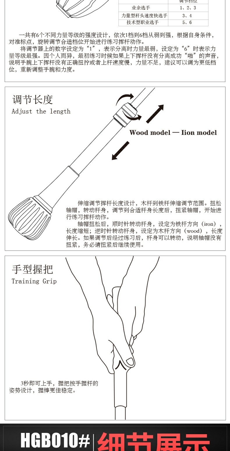 - Có thể thay đổi độ dài của gậy tập bằng cách điều chỉnh ở phần đầu gậy: độ dài cán gậy tối thiểu 37cm, độ dài tối đa 40.7cm