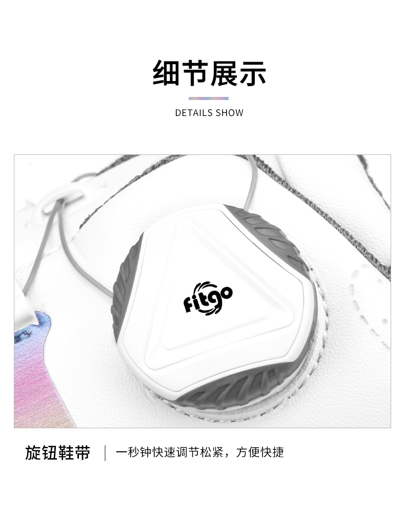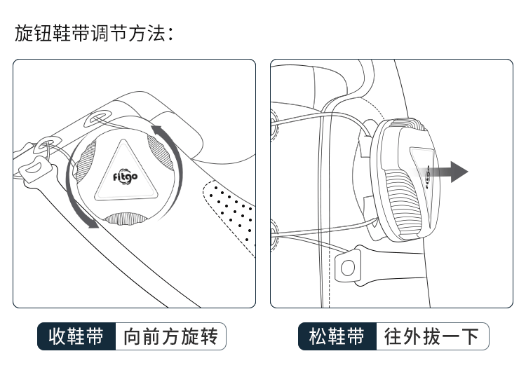 - Hệ thống dây giày xoay FITGO mới, buộc dây và cởi dây giày nhanh chóng chỉ bằng cách bật nút và xoay núm. Xoay theo chiều kim đồng hồ để nới thắt chặt dây và xoay ngược chiều kim đồng hồ để nới lỏng dây.