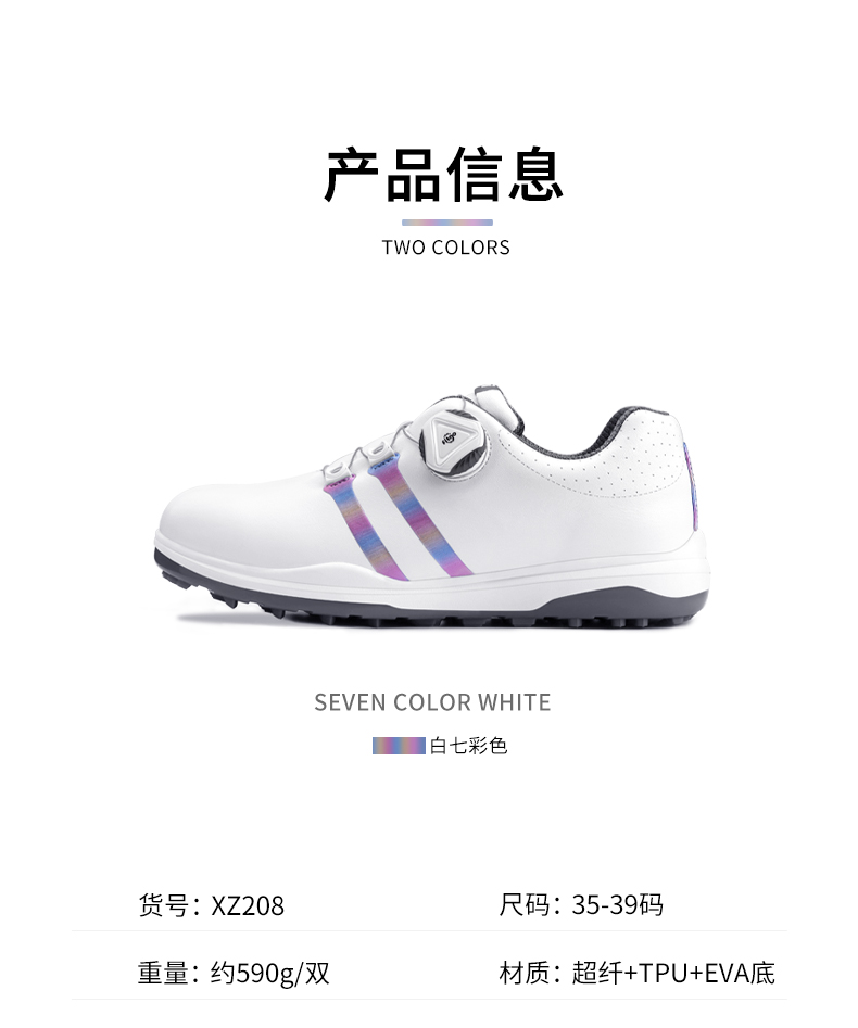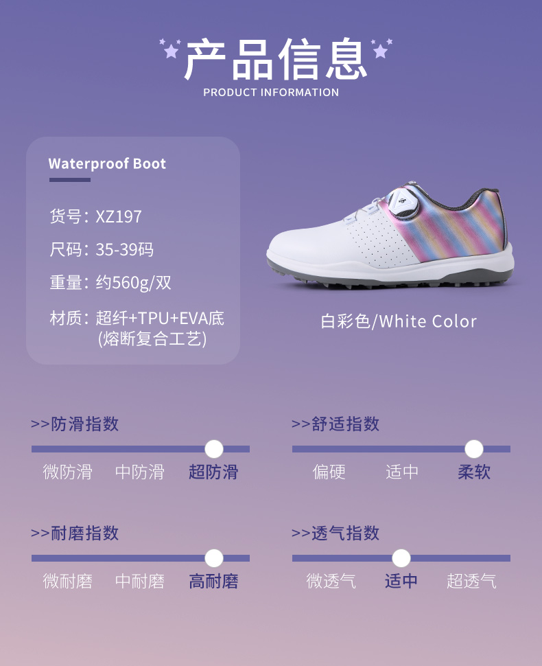 Là mẫu giày mới nằm trong bộ sưu tập 2022 với thiết kế thời trang, nữ tính và tính năng chống thấm nước vượt trội, đế giày 3 lớp gồm 1 lớp là xốp EVA và lớp đế lót có lỗ thoáng khí đem lại trải nghiệm siêu êm ái và thông thoáng cho nữ golfer.