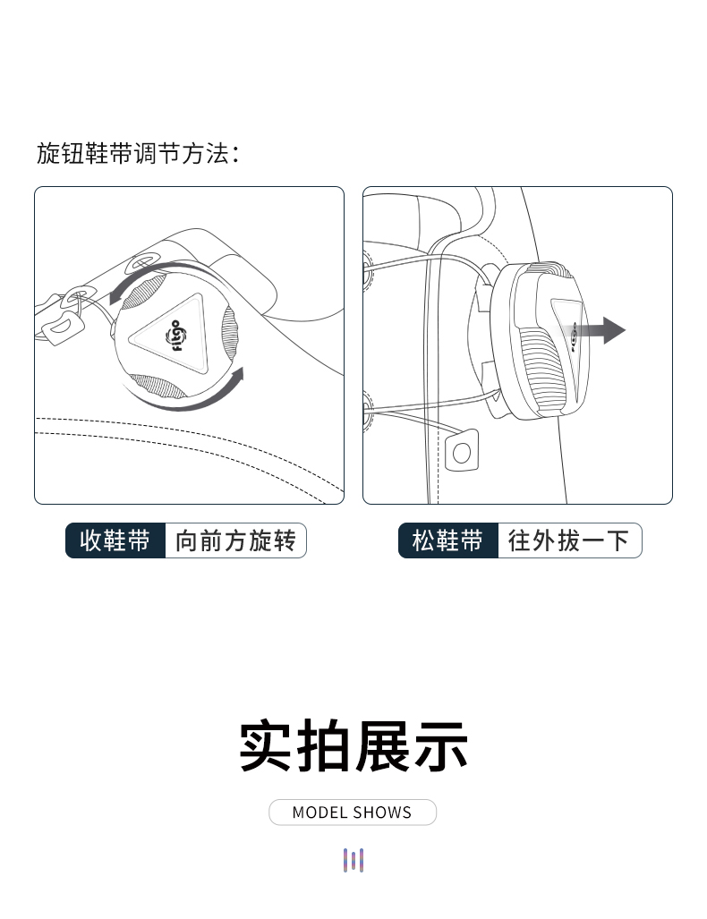 - Hệ thống dây giày xoay FITGO mới, buộc dây và cởi dây giày nhanh chóng chỉ bằng cách bật nút và xoay núm. Xoay theo chiều kim đồng hồ để nới thắt chặt dây và xoay ngược chiều kim đồng hồ để nới lỏng dây.
