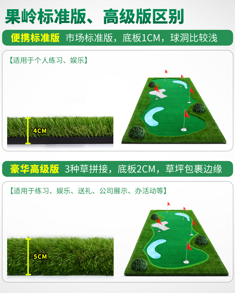 - Thảm cấu tạo 2 lớp, lớp dưới là phần đáy đệm mút cao su eva dày từ (1cm, 2cm, ...) Phía trên là mặt thảm cỏ dày 10mm và một lớp cỏ dài bao xung quanh diềm sân dày từ (4cm, 5cm...) , với ( 3, 5...) lỗ gạt bóng tiêu chuẩn bằng Inox và đi kèm với ( 3, 5...) cờ mục tiêu.