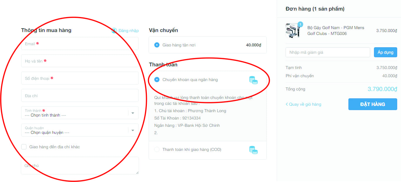 - Thanh toán chuyển khoản: TeeOff's Golf Shop xác nhận tiền về TK và chuyển hàng cho quý khách, thông báo cho quý khách mã vận chuyển và hãng vận chuyển.