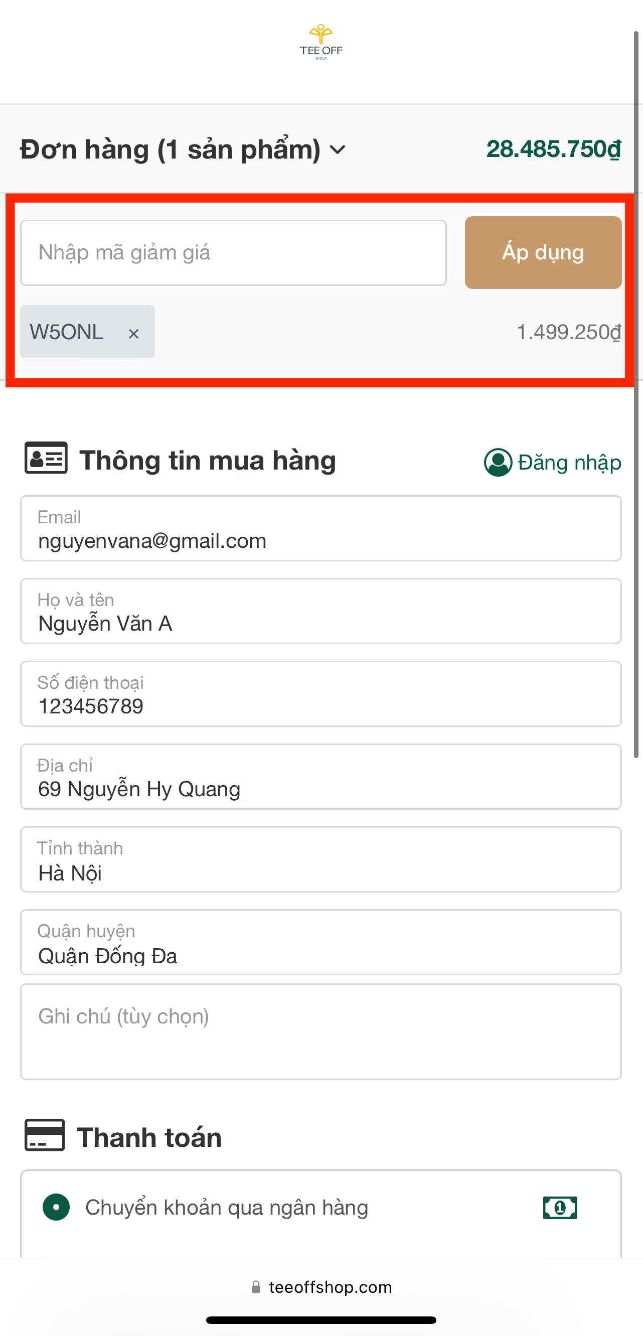 - Nhập mã W5ONL để áp dụng giảm giá trên tổng giá trị đơn hàng.