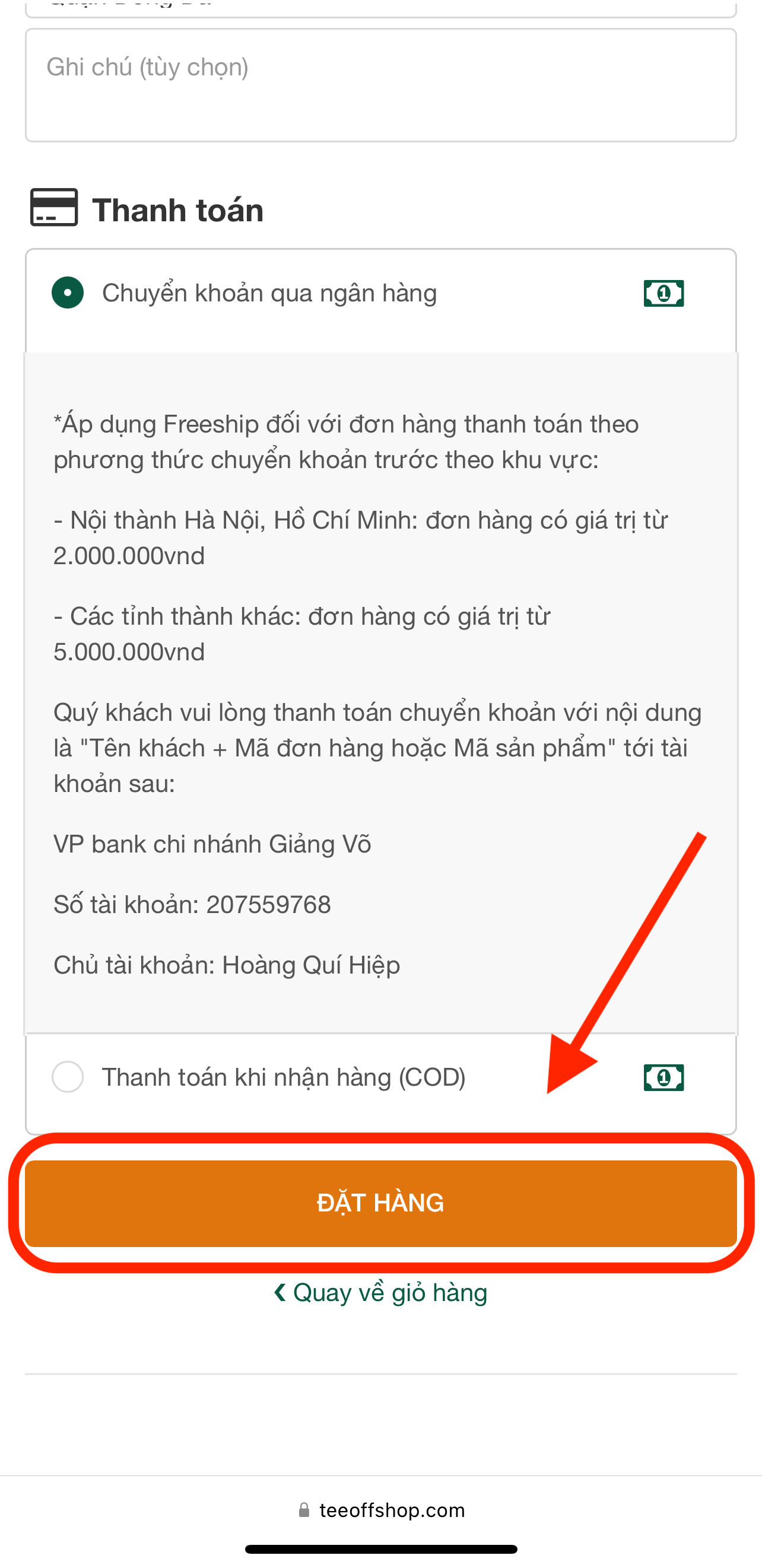 - Hoàn tất mua hàng bằng cách nhấn vào mục ĐẶT HÀNG để hệ thống ghi nhận đơn và TeeOff Golf sẽ liên hệ ngay để xác nhận đơn hàng và gửi cho quý khách.