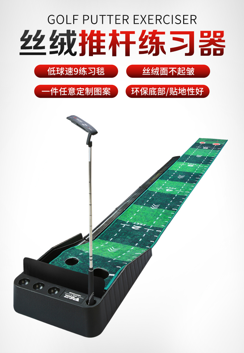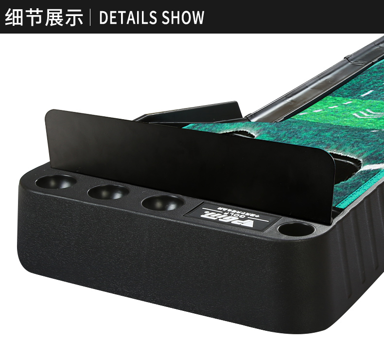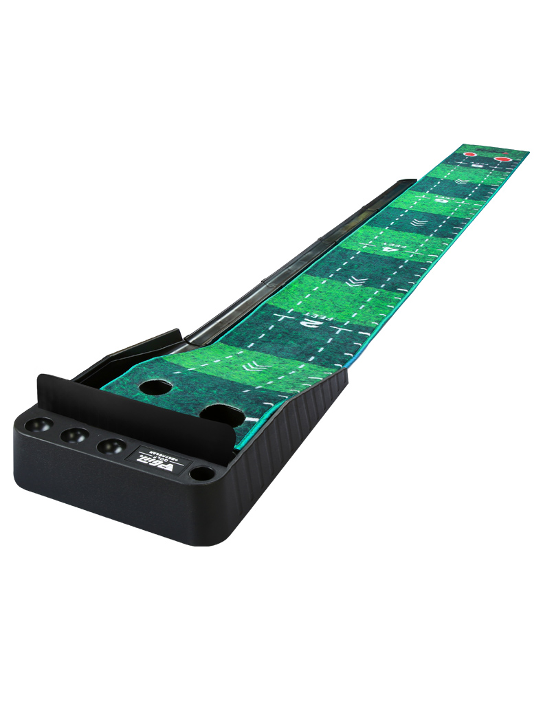 - Thiết kế sáng tạo có phần rãnh trả bóng về vị trí đánh ban đầu, giúp các Golfer thực hiện liên tiếp các cú Putt dễ dàng hơn. Ngoài ra đầu thảm còn có 1 thanh gỗ và 2 hố tròn có thể cài gậy Putt và chứa bóng.