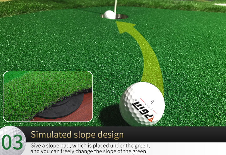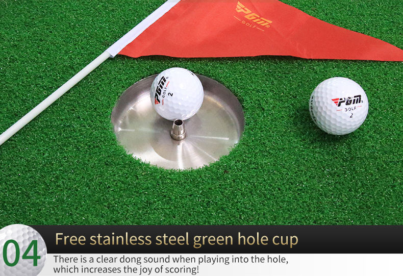 - Thiết kế sáng tạo có phần rãnh trả bóng về vị trí đánh ban đầu, giúp các Golfer thực hiện liên tiếp các cú Putt dễ dàng hơn. Ngoài ra đầu thảm còn có 1 thanh gỗ và 2 hố tròn có thể cài gậy Putt và chứa bóng.