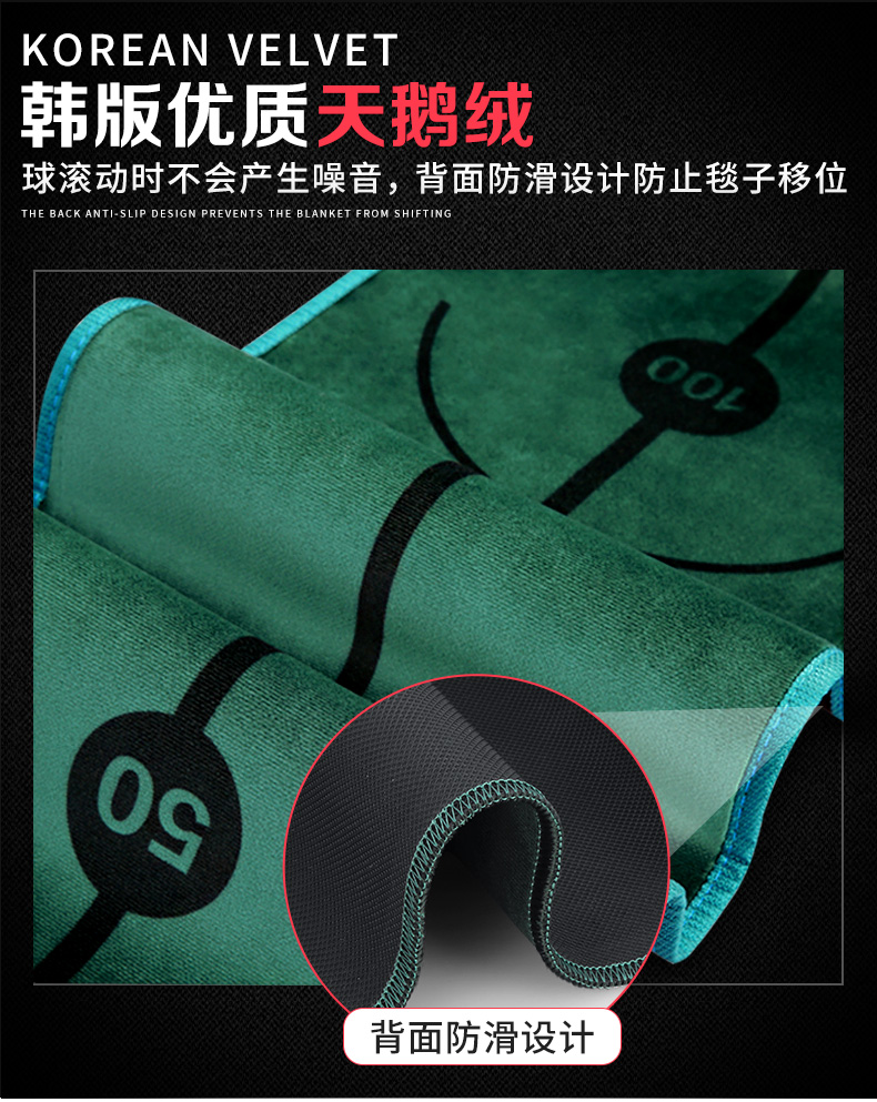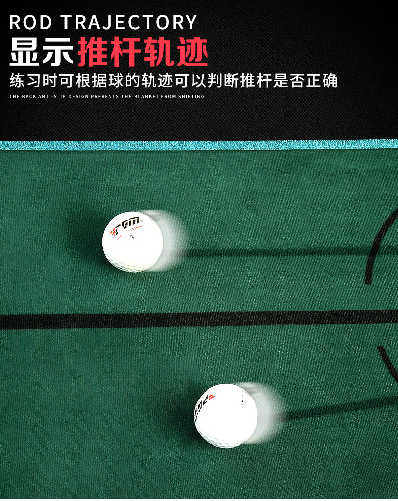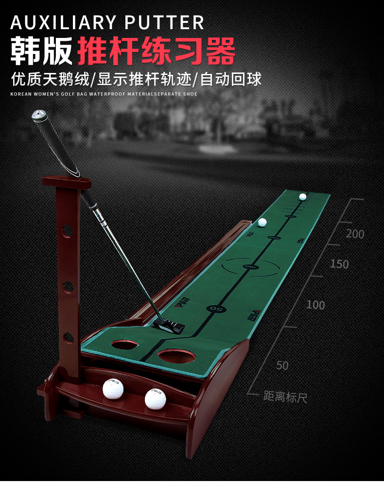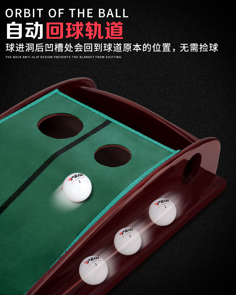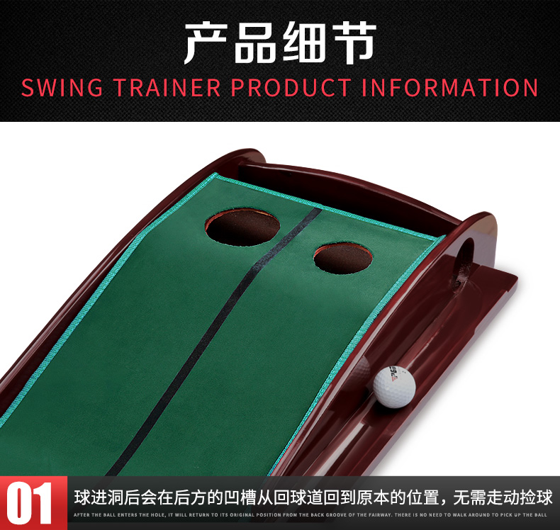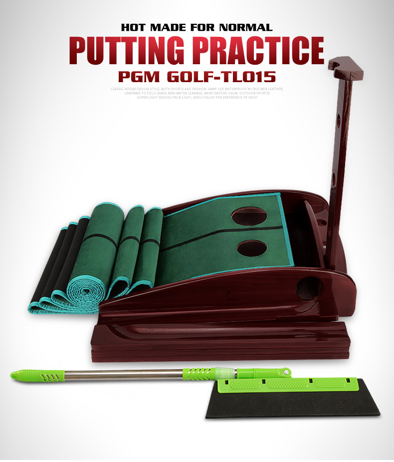 - Thiết kế sáng tạo có phần rãnh trả bóng về vị trí đánh ban đầu, giúp các Golfer thực hiện liên tiếp các cú Putt dễ dàng hơn. Ngoài ra đầu thảm còn có 1 thanh gỗ và 2 hố tròn có thể cài gậy Putt và chứa bóng.