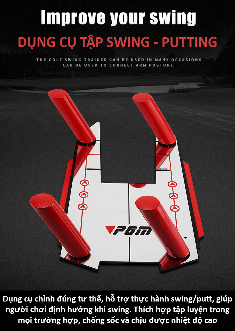 - Thiết bị giúp định hướng, chỉnh đúng tư thế, hỗ trợ thực hành Swing / Putt, Swing điều chỉnh tự do, thích hợp để thực hành trong mọi trường hợp. Chống sốc và chịu nhiệt cao.