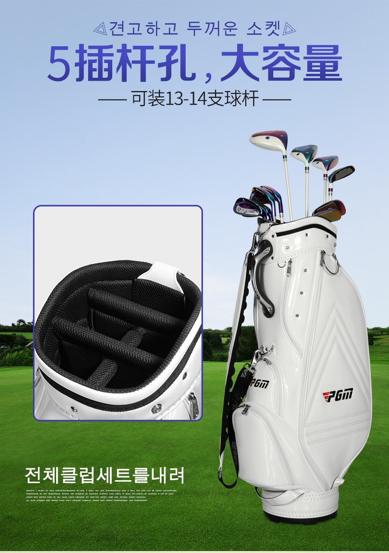 - Miệng túi rộng, có tới 5 ô cài gậy ngăn tách riêng biệt, đựng được tối đa 15 gậy, đủ cho Golfer mang tất cả các gậy cần thiết lên sân.