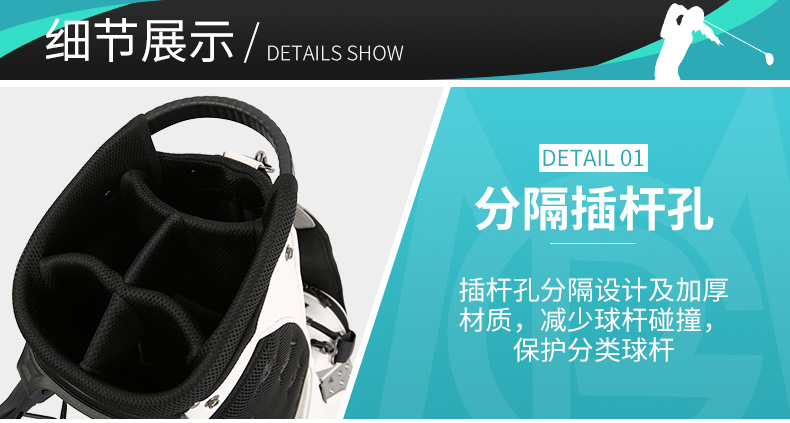 - Dễ dàng lắp vừa bộ gậy, thiết kế túi đa chức năng, mặt sau có thiết kế túi giày lớn, dễ dàng mang giày, găng tay, tee, ô và các vật dụng khác.