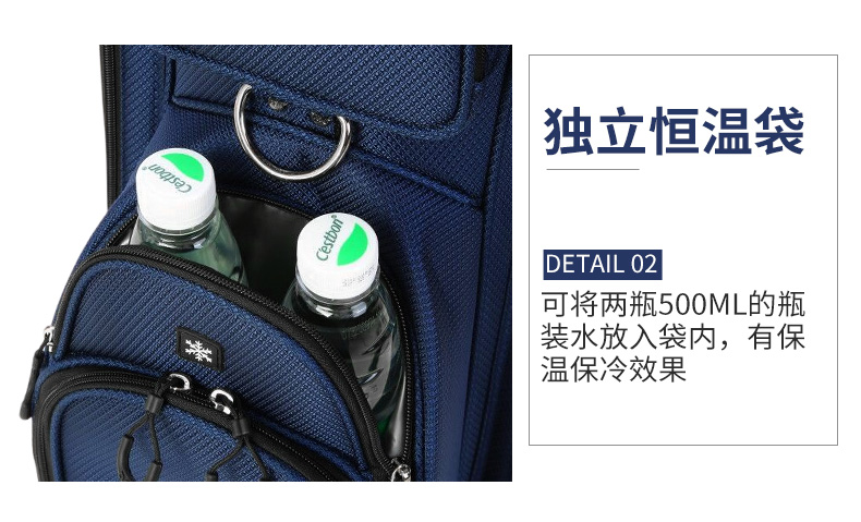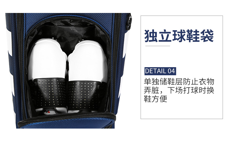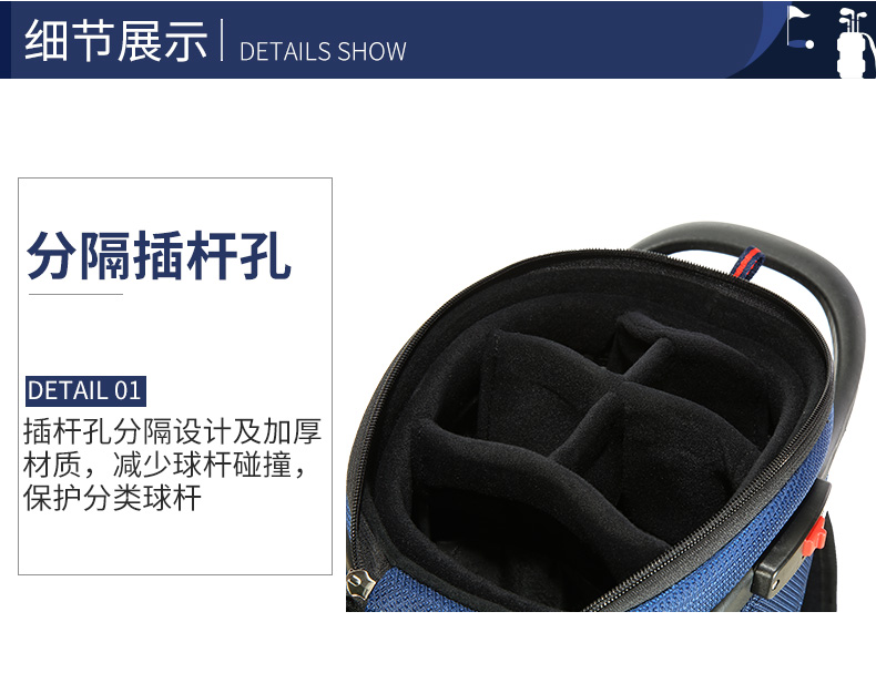 - Không gian túi gậy lớn đựng được đến 14 gậy fullset đầy đủ nhu cầu cho các Golfer để lên sân. Có 6 lỗ được ngăn cách bằng chất liệu dày hơn, làm giảm sự va chạm giữa các gậy.