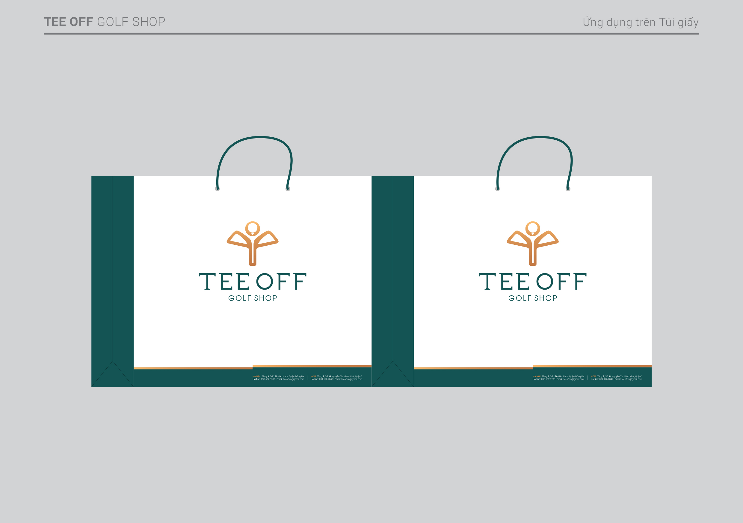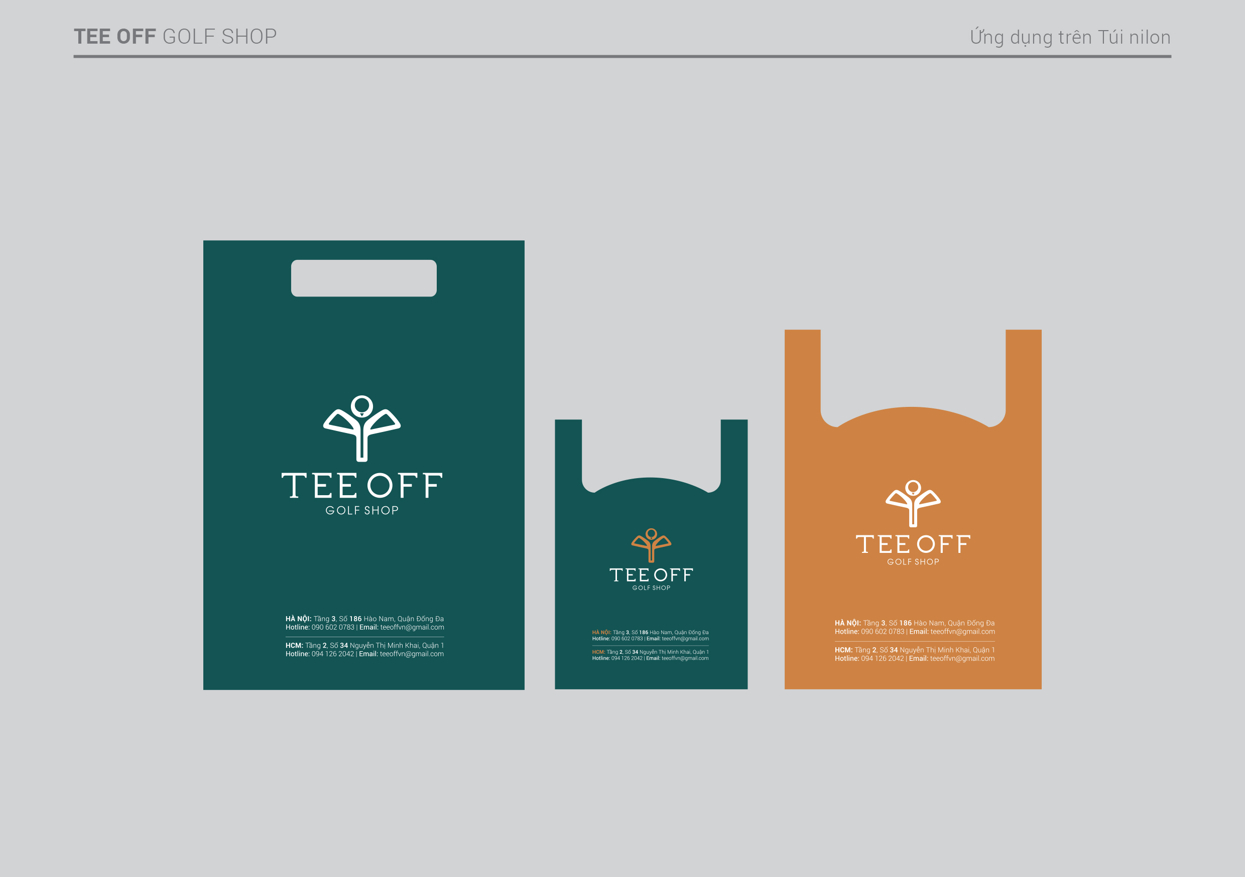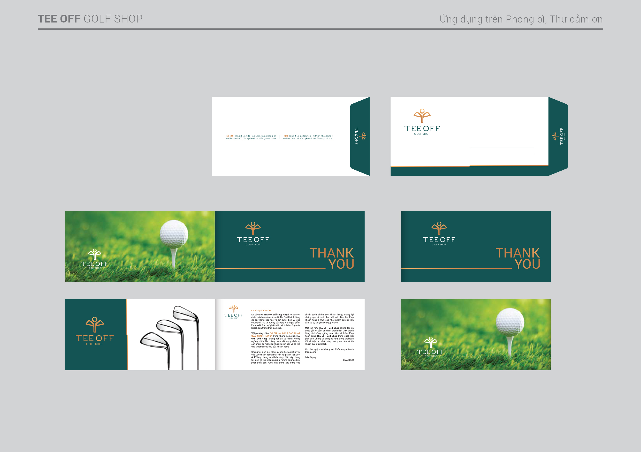Ứng dụng rộng rãi Logo vào các ấn phẩm quen thuộc: Name Card, Túi giấy, Biển hiệu cửa hàng, Biển vẫy, Thư cảm ơn, Bì thư, Đồng phục. Với mỗi ấn phẩm đến được với tay khách hàng cũng đồng nghĩa với việc cái tên TEE OFF sẽ dần trở nên quen thuộc hơn với cộng đồng Golfer trong và ngoài nước.