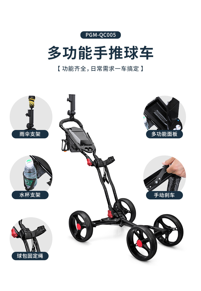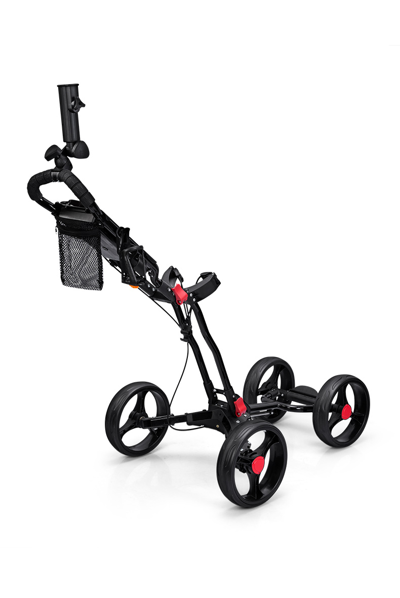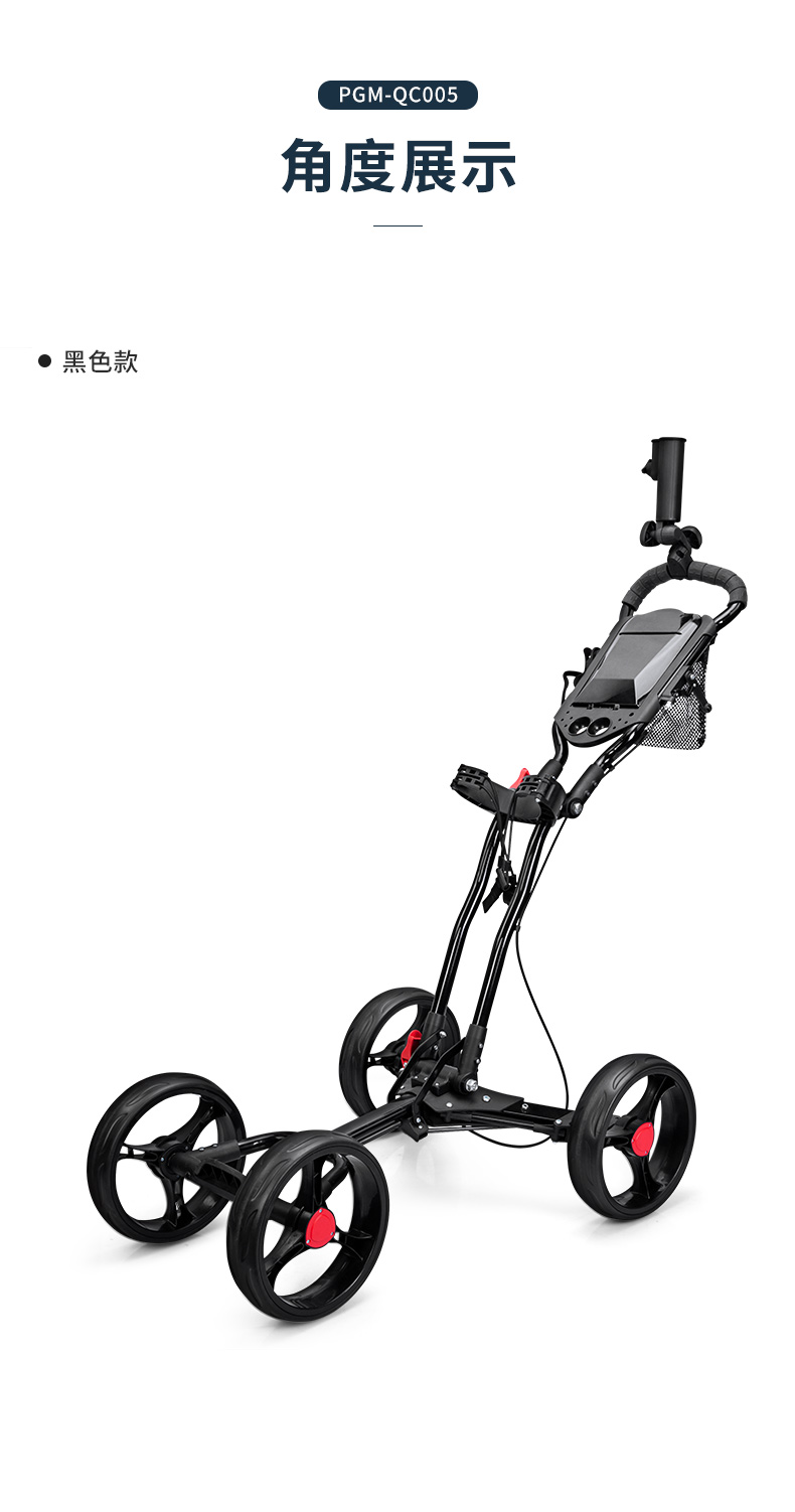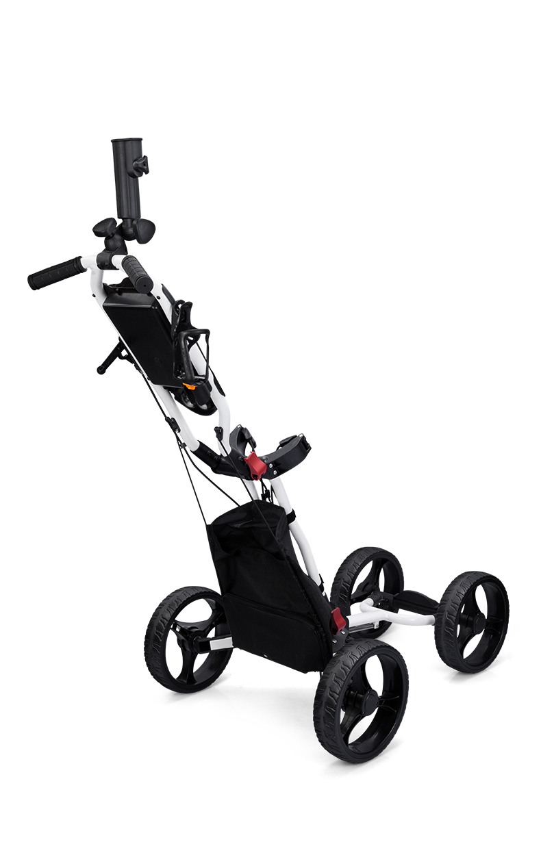 QC005 là mẫu xe đẩy túi gậy siêu nhẹ 4 bánh tiện dụng, có giá để ô, túi đựng bóng.